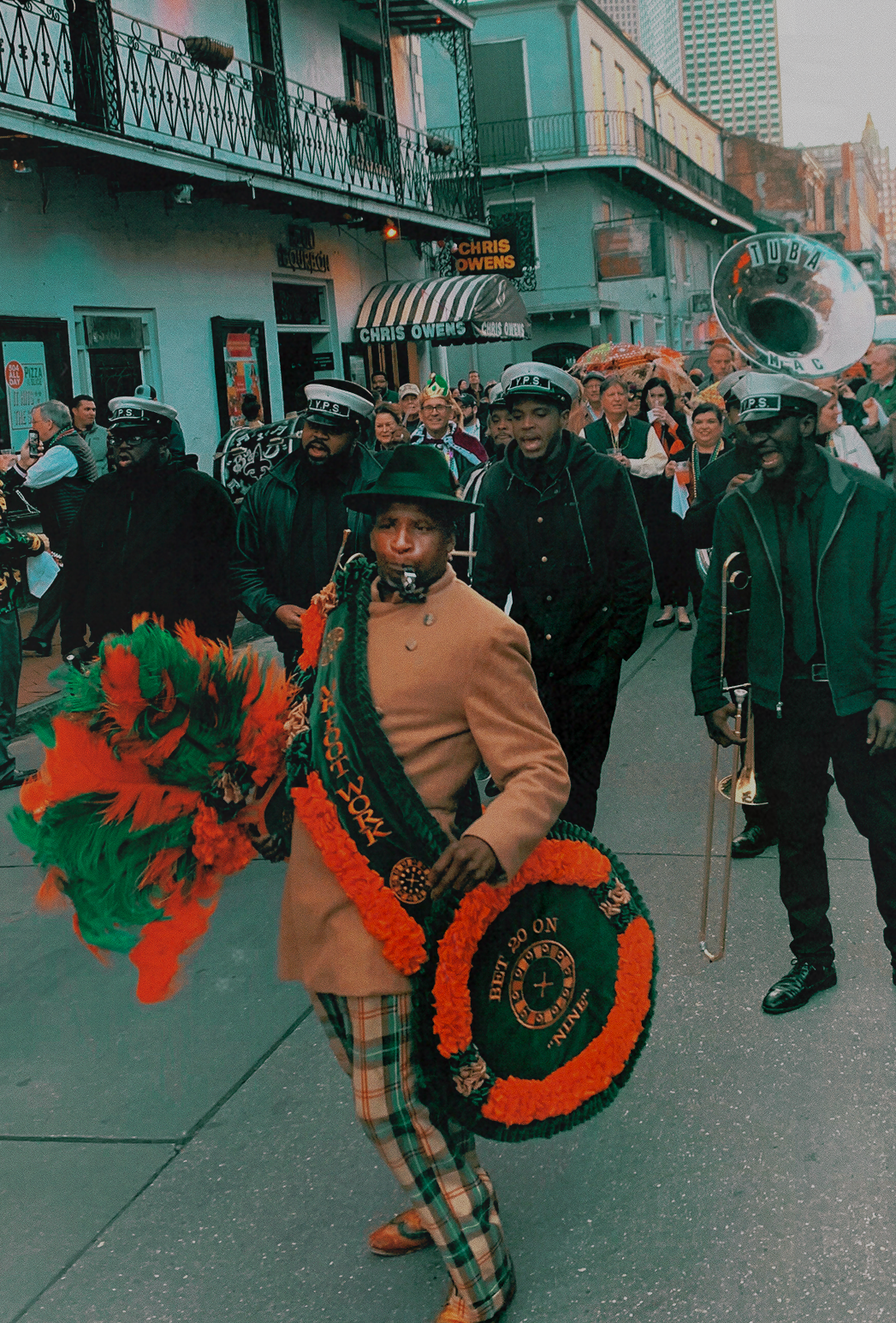 The Mardi Gras Indian is a deep part of New Orleans’ Black traditions. In a parade, their elaborate hand-beaded costumes and dancing add a striking touch.