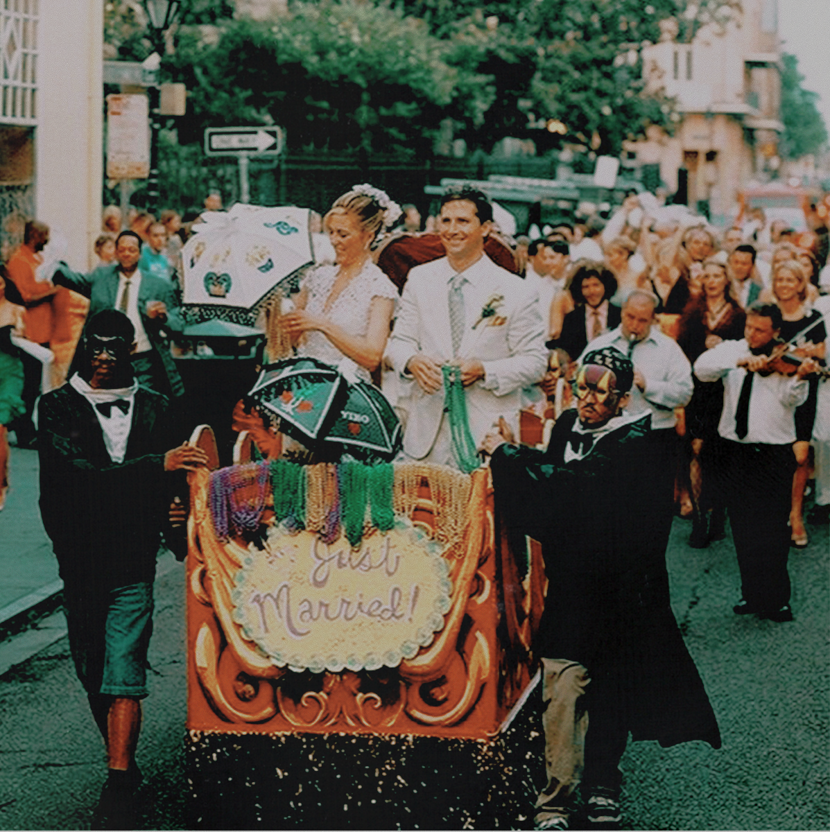 The second line parade comes from the New Orleans jazz funeral tradition. Following a service, mourners walk to the cemetery behind a mule-drawn carriage or hearse while the band plays slow, somber tunes on brass horns and drums. Following the burial, the musical mood lifts in celebration of life and the soul’s transition, and the group marches out. Those who join in comprise the raucous “second line.” New Orleans has expanded brass band-led street processions to include celebrations of all kinds.
